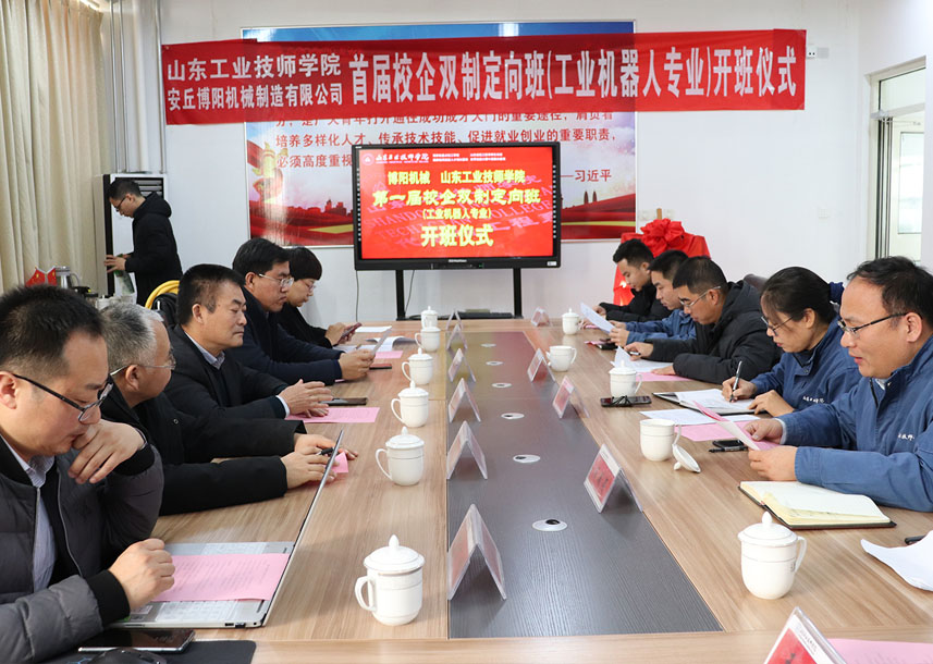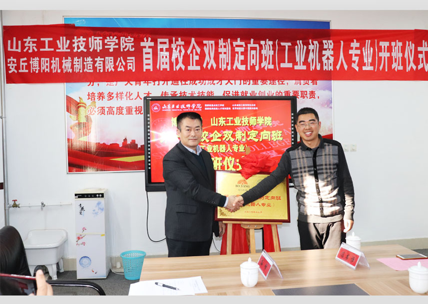 2019年12月24日上午10點,首屆“博陽校企雙制定向班(工業機器人專業)”開班儀式在山東工業技師學院舉行,山東工業技師學院教務處李新功處長參加并致辭,現代制造工程系周明鋒主任與閆吉祥總經理進行揭牌,并為孫紅金副總經理頒發“博陽校企雙制定向班”班主任聘書,閆吉祥總經理為周明鋒主任頒發博陽機械“技術顧問”聘書,齊魯理工大學王佐勛教授及公司郭偉總經理、李文明副總經理一同參加活動。