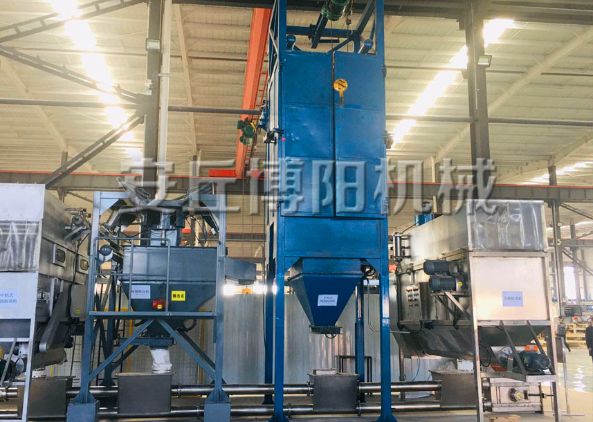 包裝袋由電動葫蘆提升,包裝袋的袋繩掛在鋼性支架上,手動操作控制葫蘆升降和行走,沿著行走導軌運行到卸料區上方落下,將包裝袋放置在支架托盤上,使大袋處于卸料位置。然后手動打開卸料閥操作門,人工將包裝袋的卸料口拉入到卸料閥的系口出,按下系帶按鈕,卸料閥束緊氣缸將袋口鎖緊,再手動將大袋的卸料口從卸料位置拉下,罩在卸料口密封箱內的出料管外側,按下壓袋機構氣動控制開關,使密封法蘭下降,并緊壓在出料管的管端,密封卸料通道,以防卸料過程中粉塵漏,接著,人工解袋,后,關上操作門。手動開啟與卸料口密封箱連接的通風除塵管道上的閥門。至此,卸料準備過程結束。
