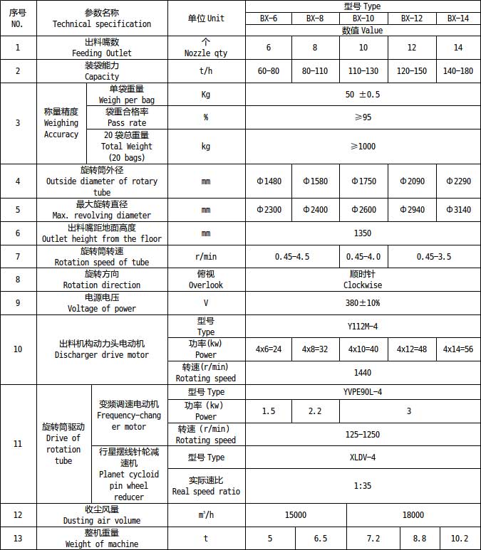 型回轉(zhuǎn)式水泥包裝機(jī)采用變頻調(diào)速的主傳動(dòng)系統(tǒng),偏心入料的回轉(zhuǎn)結(jié)構(gòu),配置有無(wú)觸點(diǎn)接近開(kāi)關(guān),上下料位測(cè)控等機(jī)電自動(dòng)控制及微機(jī)自動(dòng)計(jì)量裝置。在操作過(guò)程中,除人工插袋外,其它如水泥袋壓緊、灌裝、計(jì)量閘板啟閉、定點(diǎn)掉袋等均可自動(dòng)連續(xù)完成。并具有不插袋不灌裝,袋重不達(dá)到設(shè)定值不掉袋,袋子意外脫落立刻關(guān)閉閘板停止灌裝等獨(dú)特功能。包裝機(jī)設(shè)計(jì)有六嘴、八嘴、十嘴、十二嘴、十四嘴機(jī)型,根據(jù)用戶需要還可承接特殊類(lèi)型的包裝機(jī)設(shè)計(jì)改造工作。