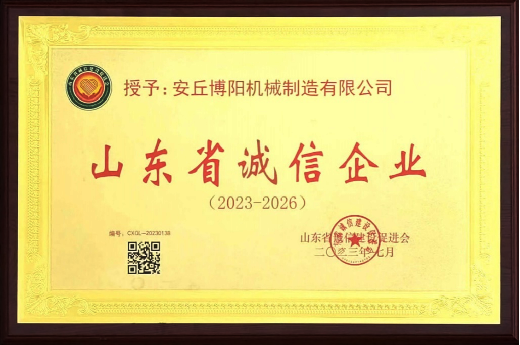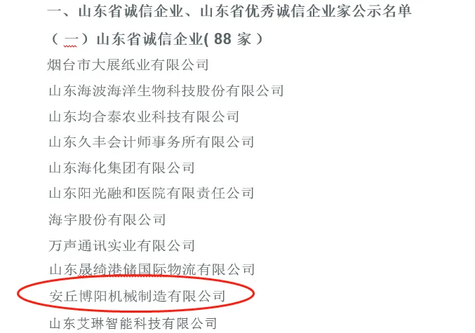 喜報!博陽機械榮獲“山東省誠信企業”稱號