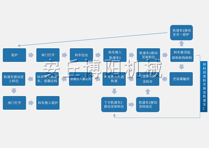 氰尿酸自動翻盆倒料機器人實現料車及容器的自動化環形轉運,原料自動上料,物料從容器中自動卸料、輸送,以及末端粉碎機自動分配進料。