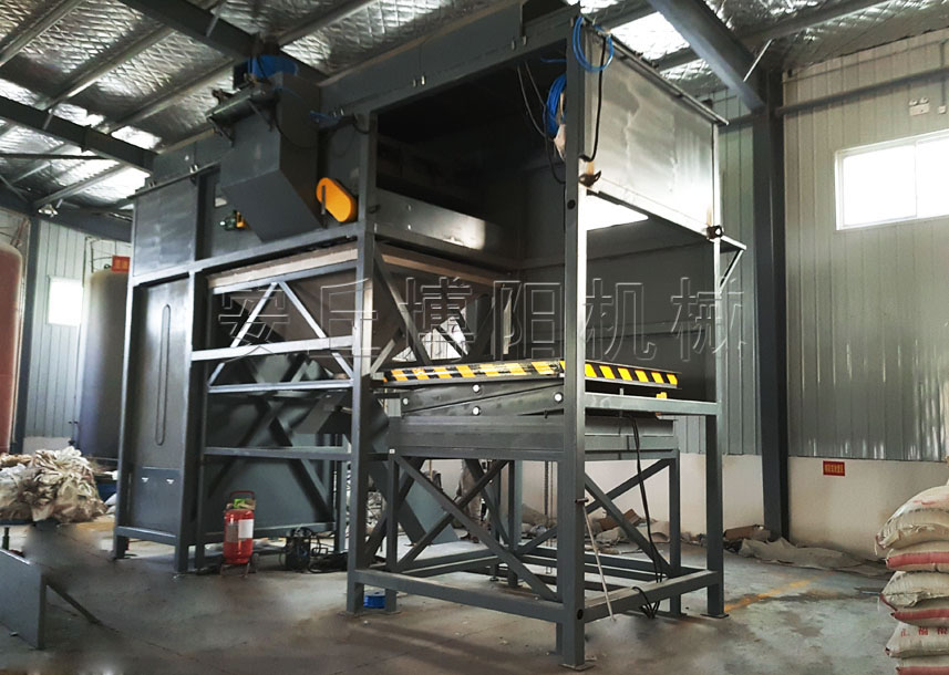 將碼好的編織袋物料由叉車放置到滾筒輸送機上,可一次放置多組,碼好的物料經(jīng)滾筒輸送機送至提升裝置的位置,提升裝置將碼好的物料抓取一次5行走裝置輸送至割刀,編織袋經(jīng)旋轉割刀分離的物料落至出料斗,篩分裝置將殘留物料與編織袋分離,編織袋經(jīng)旁路出口落至廢袋壓縮收集裝置。